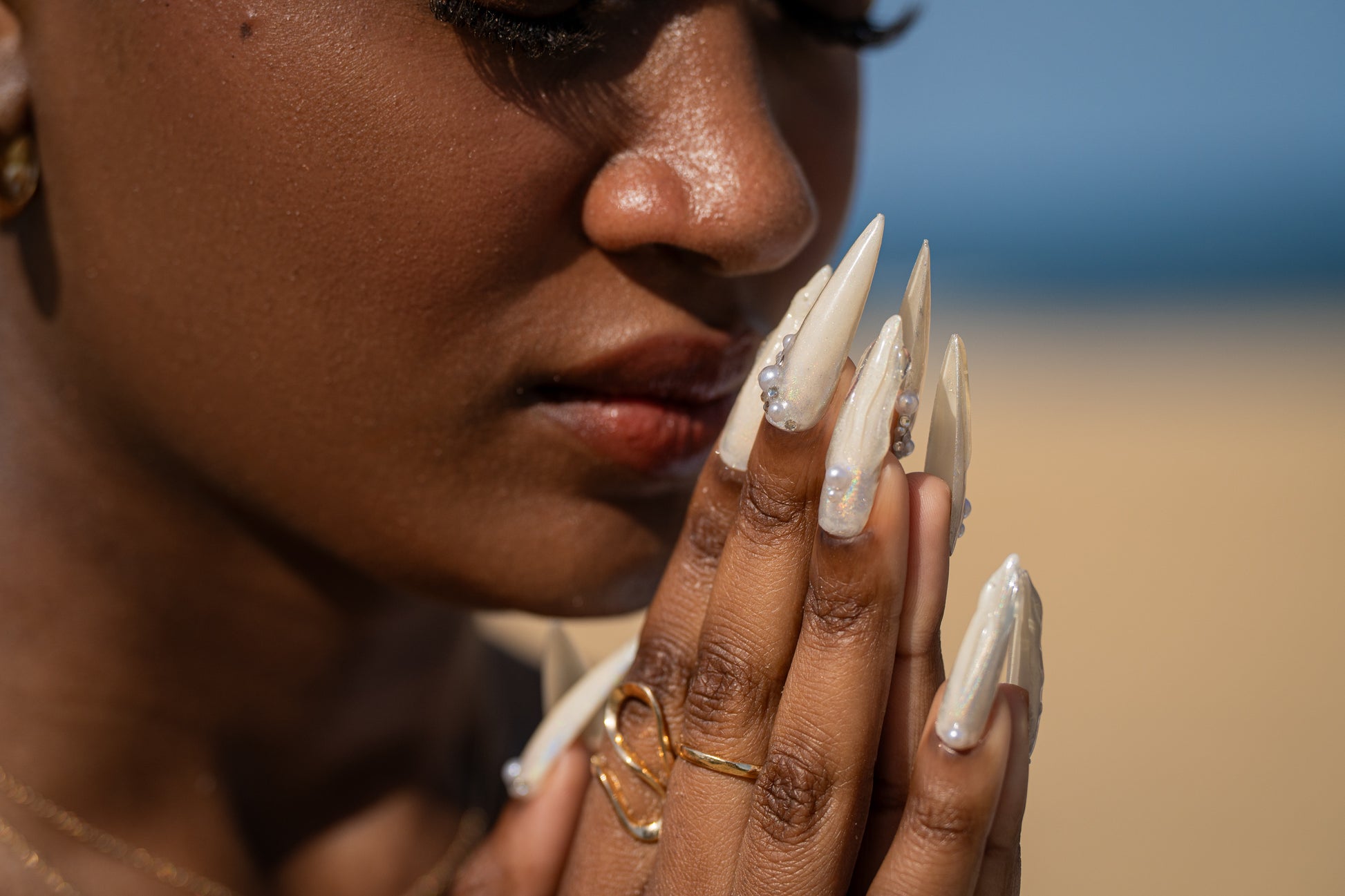 Cream colored base with 3D designs, silver chrome, pearl and diamond accents.